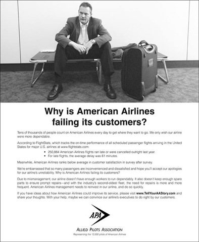 aa_adTo add to the airline’s misery, its pilots union went on the offensive as the Allied Pilots’ Association took out a big ad in USA Today to attack the airline’s management. The ad links to a new site called Tell Your AA Story, which claims to be “produced by a group of concerned American Airlines employees.”